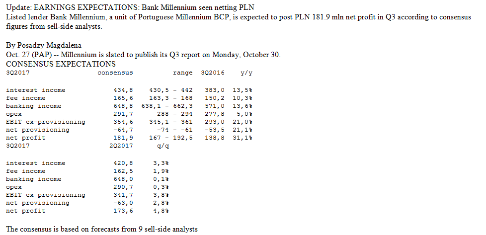Update: EARNINGS EXPECTATIONS: Bank Millennium seen netting PLN