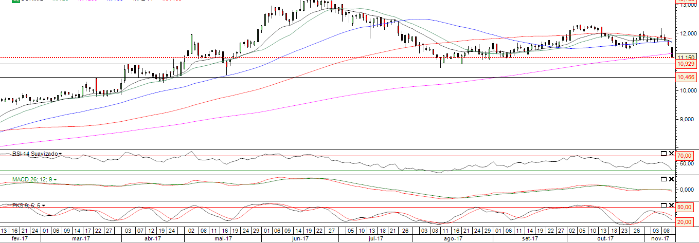 Neste momento a tendência do diário é já bem evidente e, no semanal, as subidas ficaram comprometidas esta semana com o fecho abaixo do suporte...