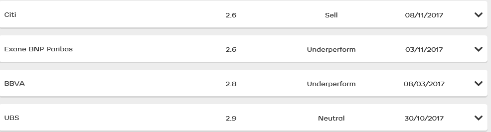 Segundo a Bloomberg, a recomendação foi reduzida de equal-weight para underweight () e o price-target passou de 3,3 euros para 2,9 euros (uma descida de cerca de 12%), dando agora à acção um potencial de desvalorização de 0,8% em relação ao valor de fecho desta segunda-feira (2,922 euros).