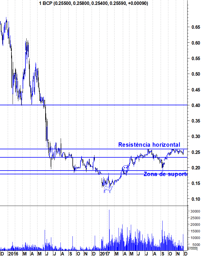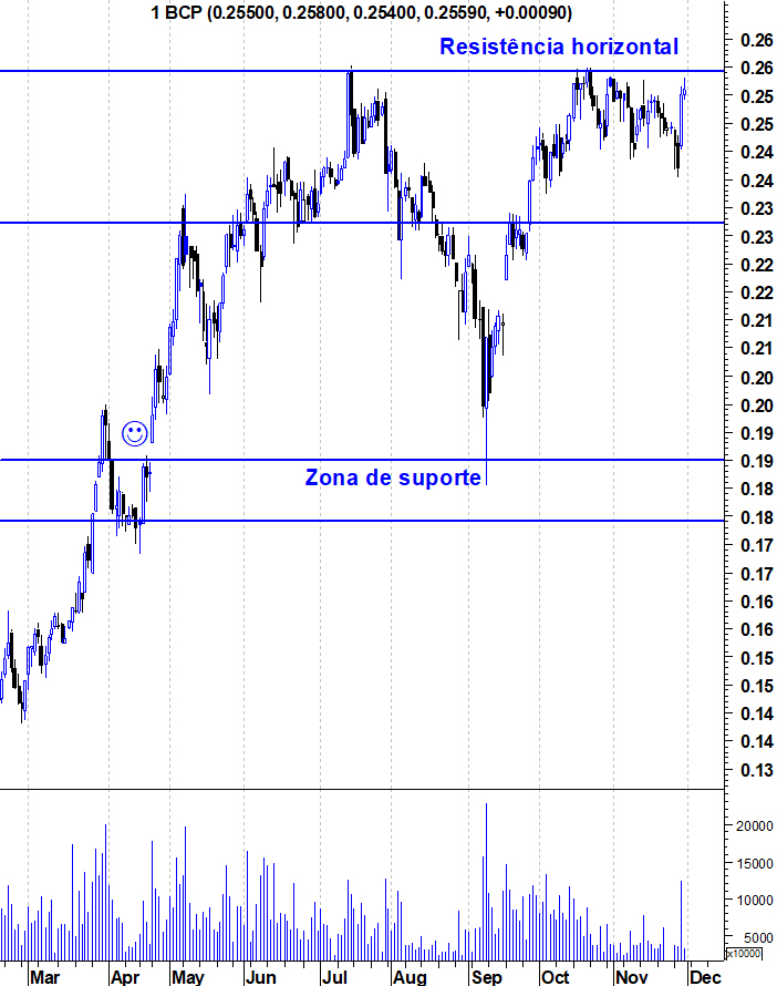 O BCP continua a "flirtar" com a resistência dos 0,26 euros. Já lá vai quase um ano de "Bull Market" e os touros dominam em todos os horizontes temporais. Um dos aspectos que mais entusiasma no gráfico é ver o que se segue à resistência dos 0,26 euros pois a descida foi feita a pique não criando resistências para o futuro.