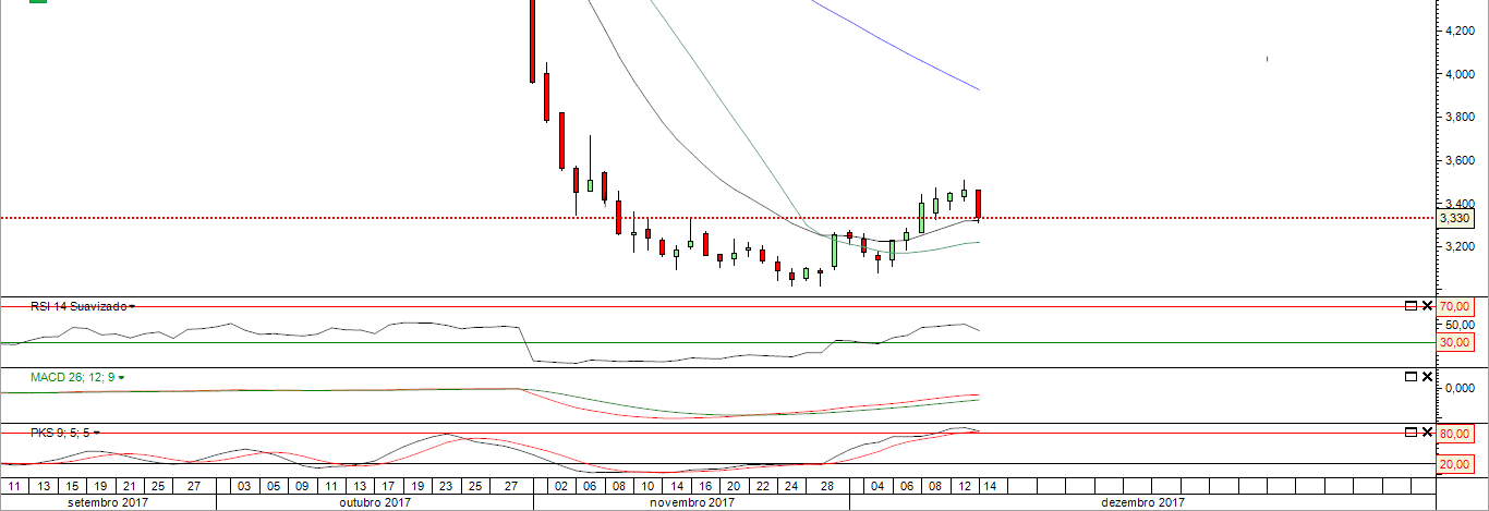 Indicia fortes vendas com vela feia de inversão a terminar em mínimos do dia com queda de 3,76% e volume enorme de 2 milhões de títulos, sendo a primeira queda em 7 dias, e suportada nos mínimos do dia pela MAE 14, ( Suporte técnico ).