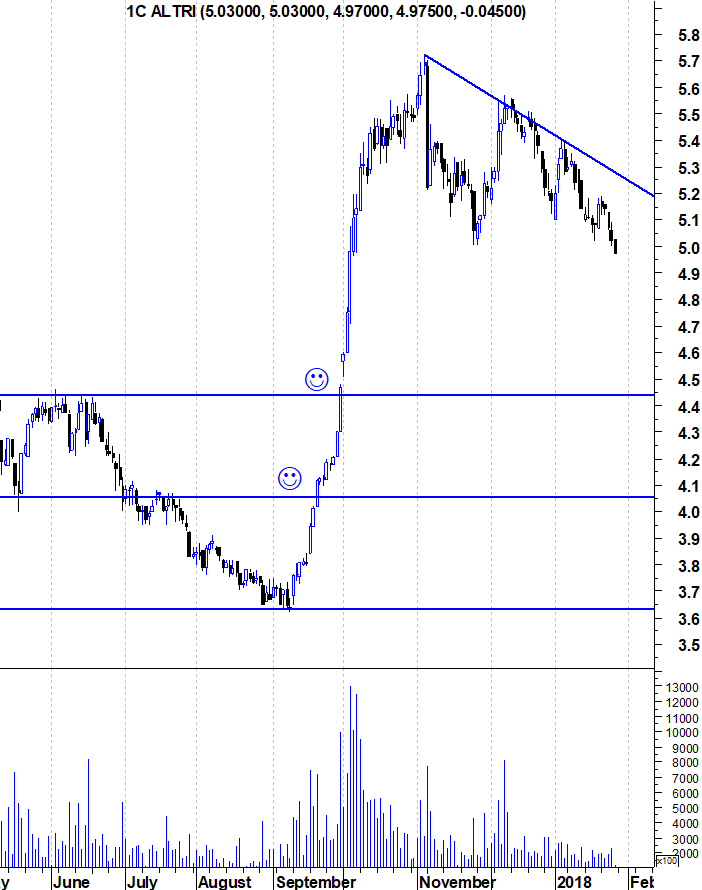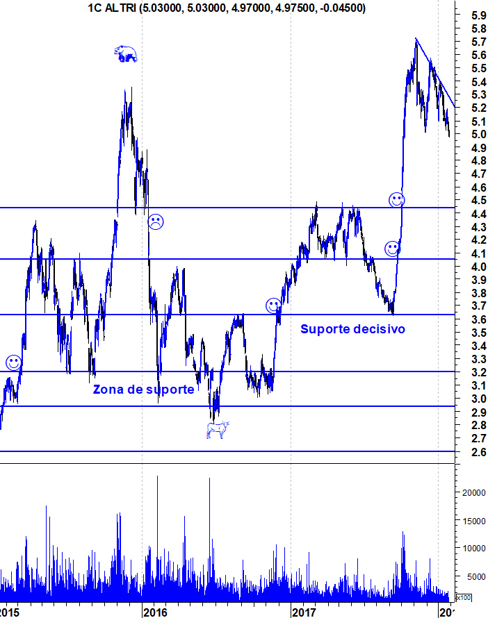Um dos gráficos interessantes. A Altri depois de atingir o máximo histórico em Novembro, tem estado a retrair depois daqueles 2 meses explosivos. Para quem está de fora e quer entrar ou deve esperar por uma retracção até mais perto do suporte ou então pela quebra da LT descendente que tem marcado o ritmo de quedas dos últimos meses pois se essa linha for quebrada, o ataque dos touros pode ser de novo explosivo.
