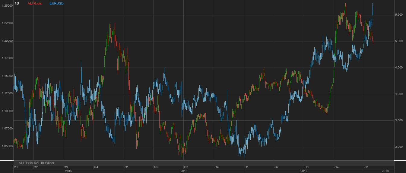 A verde/vermelho a Altri, a azul EURUSD.