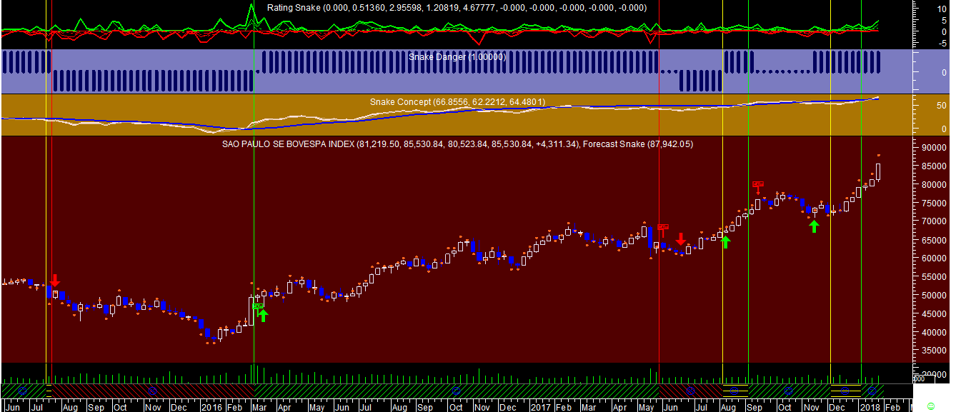 Um dos indicadores do gráfico que deixo abaixo, o das pintarolas laranjas junto às cotaçöes, mostra que há uma boa probabilidade do Bovespa encerrar a semana do dia 2 de fevereiro próximo da zona dos 87.940 pontos, está agora nos 85.530, mas evidentemente isso já é muita macumba e portanto há que näo levar essa previsäo muito a sério.