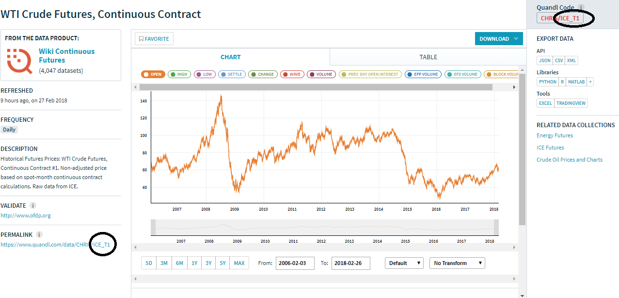 Deixo em baixo exemplo com WTI Crude Futures, Continuous Contract: https://www.quandl.com/data/CHRIS/ICE_T1-WTI-Crude-Futures-Continuous-Contract
