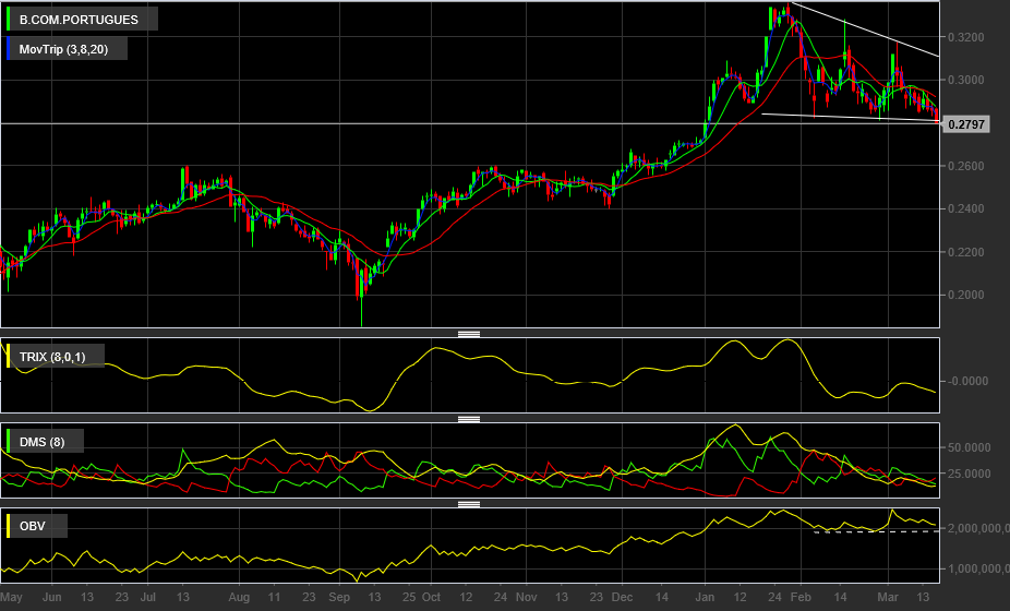 Só após quebrar os 0.28 em baixa poderá ter uma reacção mais forte de descida em direcção ao suporte natural da MM200 nos 0.26