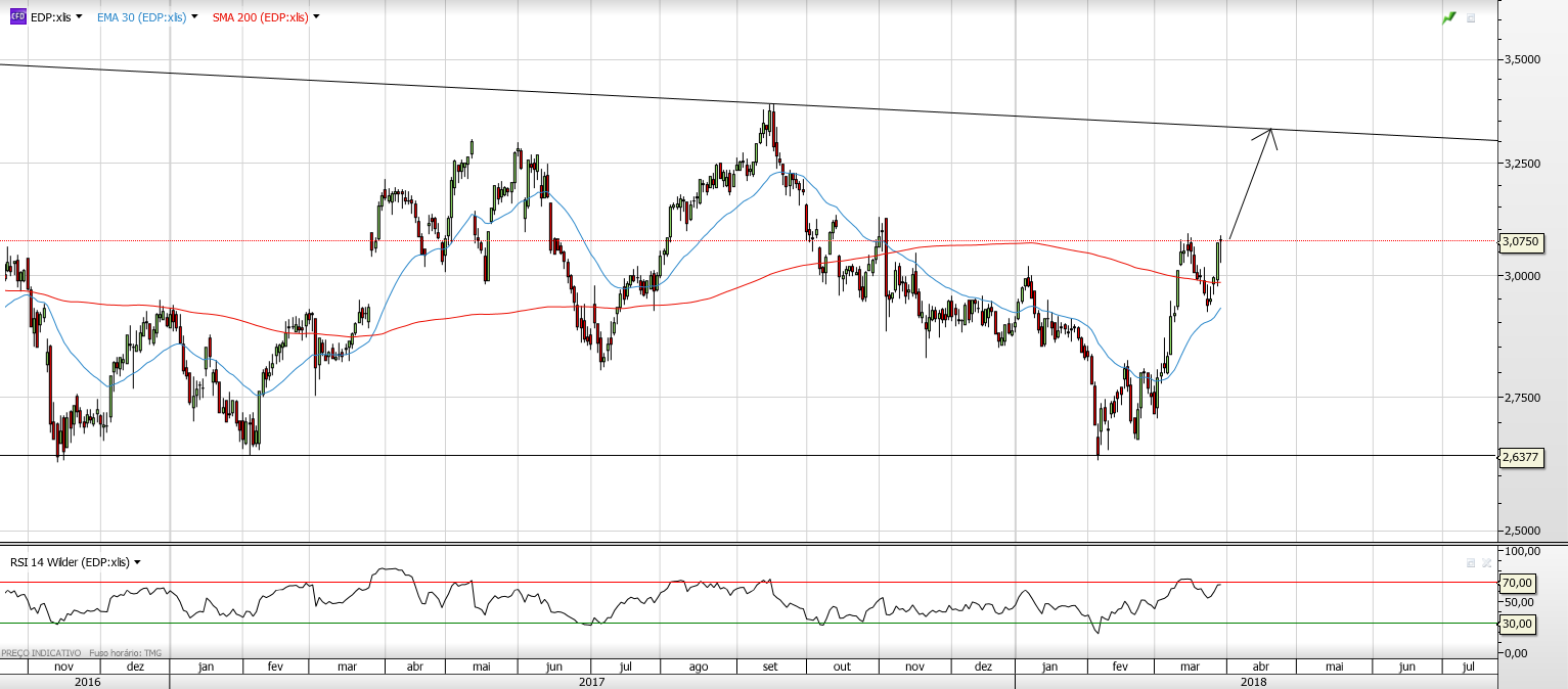 Ok, eu explico melhor a minha ideia. A EDP está a lateralizar (como se vê pela SMA200 flat) entre o suporte nos 2.63 e a LTD; logo na minha opinião o mais provável é ir testar a LTD