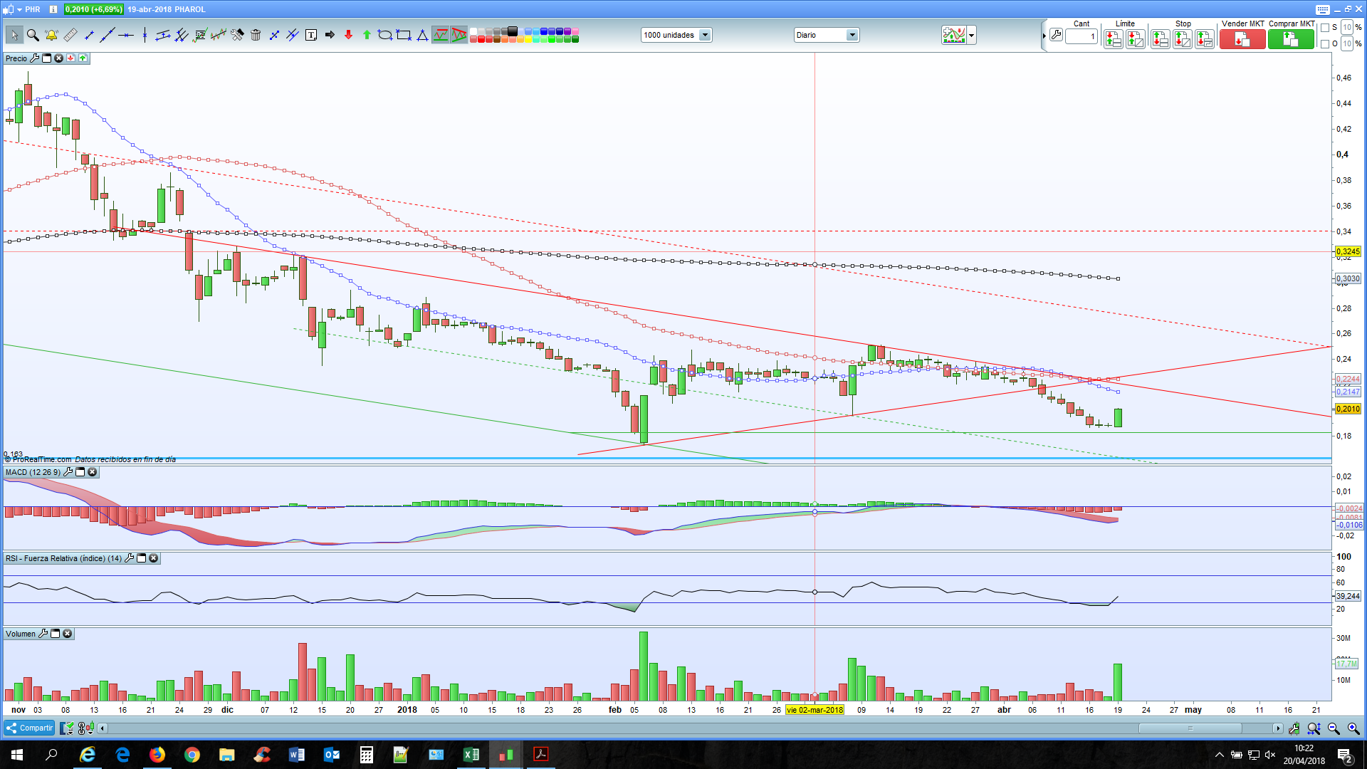 Podes colocar aí um gráfico dos teus da Pharol. Também concordas que os 0,22€ são o próximo obstáculo? Entrei ontem a 0,1996€ apenas na base da especulação, dado o volume de ontem e hoje e face aos indicadores que indicavam sobrevenda.