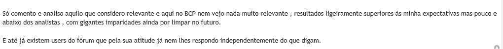 Thoth Escreveu:EAGLETRADER20 Escreveu:Na minha previsao muito otimista vejo rl 1 tri maximo de 70 M e isso não justifica este preçoEAGLETRADER20 Escreveu:Só comento e analiso aquilo que considero relevante e aqui no BCP nem vejo nada muito relevante , resultados ligeiramente superiores ás minha expectativas mas pouco e abaixo dos analistas , com gigantes imparidades ainda por limpar no futuro.
