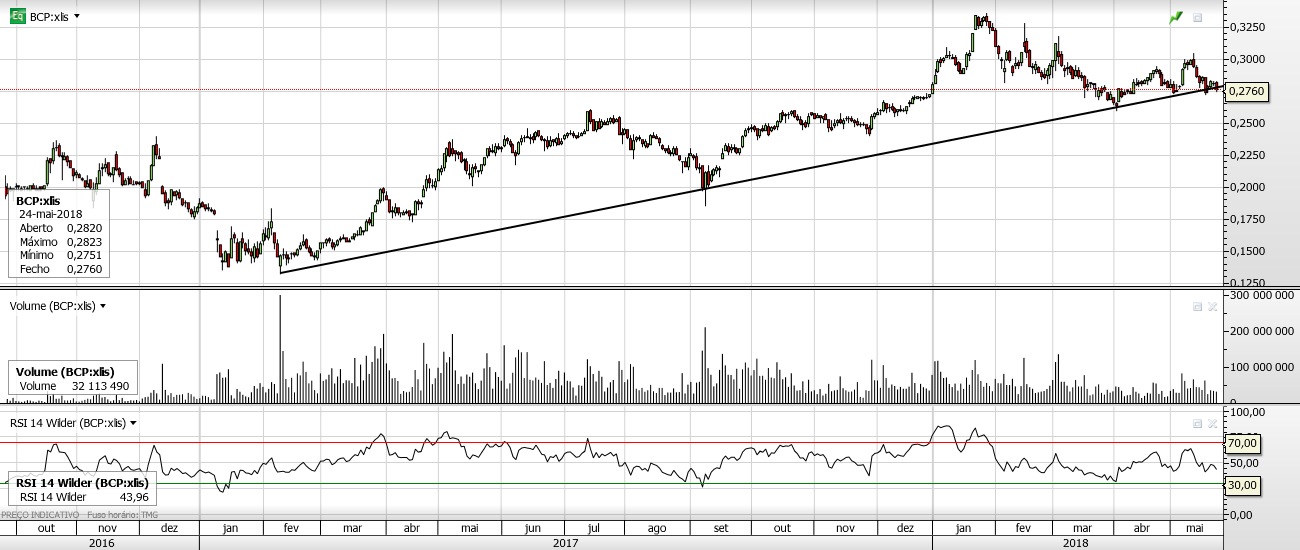Enquanto o PSI subia alegremente depois de passar a resistência dos 5.500, o BCP em contraciclo corrigia.
