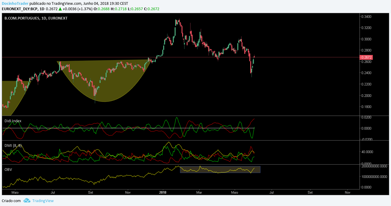Aqui o bcp está ainda a acumular,muitos já saltaram na pernada de baixa que houve o que foi uma excelente oportunidade para entrara para quem estava fora.O didi index está neste momento a dar uma compra falsa,pelo que podemos ter alguma correçao,no entanto o caminho continua para cima