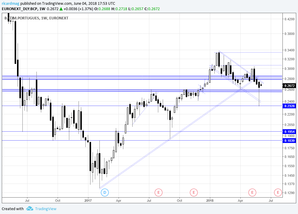 Concordo que o RSI esteja reduzido e permita ainda uma subida interessante até aos 0,28€ no entanto a quebra da MM200 terá que ser consistente e com um bom volume, fechando a próxima semana acima desta. A meu ver isto seria interessante para reforçar a permantência numa tendência bull.