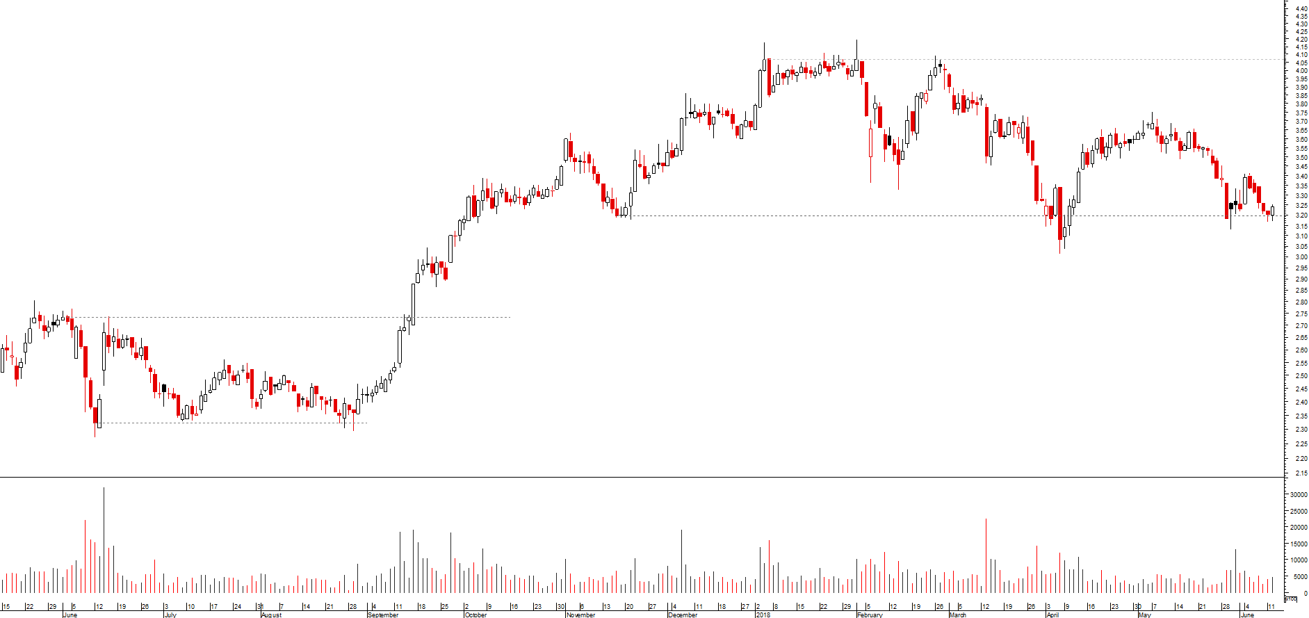 Apesar do suporte mais próximo (na zona dos 3,16x) poder travar algumas quedas, a tendência é para baixo, estando desde o inicio do ano a fazer lower lows e higher lows.