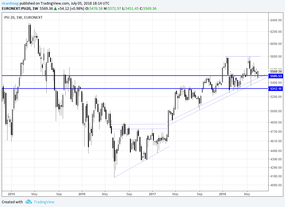 Ficam os gráficos actualizados do principal índice português que caminha para a sua resistência dos 5800 pontos. Mantenho a convicção que será apenas uma questão de tempo até a mesma ser quebrada.