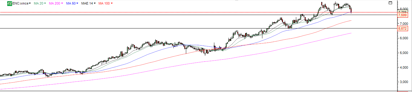 Enquanto se encontrar abaixo da MM50 e visto estar em topo multianual a probabilidade maior é corrigir até primeira zona de suporte na zona dos 8 euros