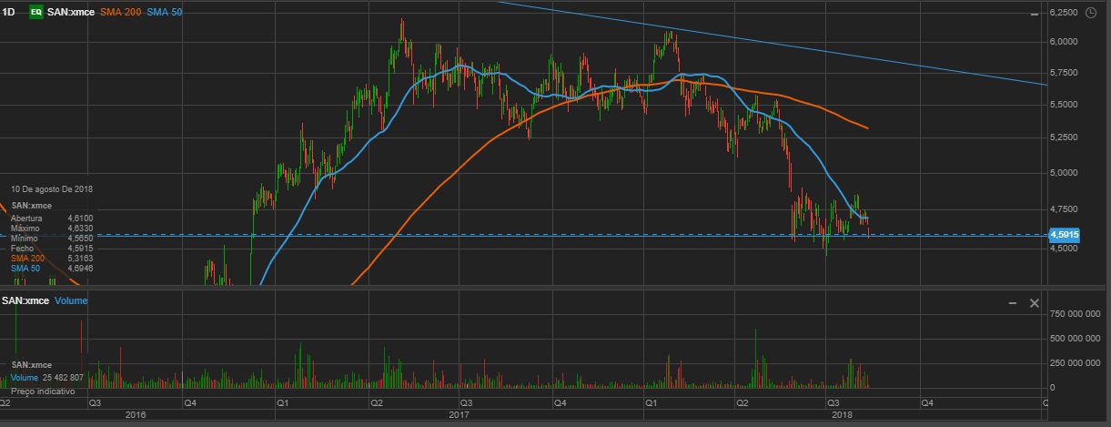 Considero que o BCP está em possível início de bull market (Longo prazo) pelo que se vê no gráfico, sem suportes a serem quebrados consistentemente há meses, estando o preço numa zona importante neste momento. No entanto é preciso ter em consideração que o sector da banca europeia está em bear market (na MMO) e isso tem obviamente um efeito nocivo no BCP. Anexo também os gráficos, por exemplo, do Santander, do Deutsche Bank e do BNP Paribas, todos em tendência de queda ao contrário do BCP. Como todos sabemos, dentro da mesma indústria tende a haver um efeito de "arrasto colectivo" e creio ser isso que está a impedir ao BCP que suba, deixando-o a lateralizar.