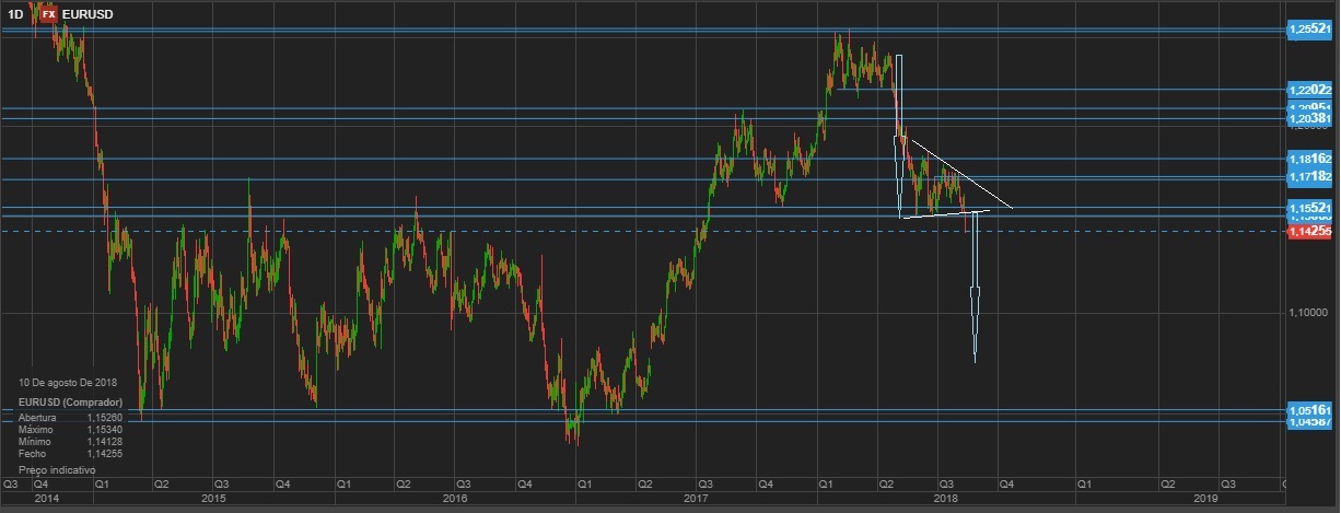 O EUR/USD já bateu em 1.1460 e tem potencial para cair mais ainda, sendo o suporte em 1.13 - talvez lá chegue, mas não será fácil para já.