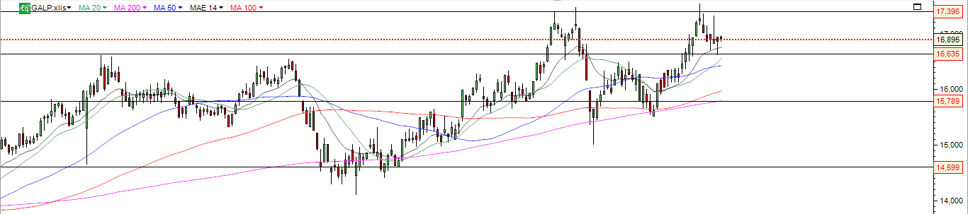 A GALP após ter ido pela terceira vez visitar a zona 16.50 - 17 euros , iniciou a correcção acompanhando a correcção do Petroleo.