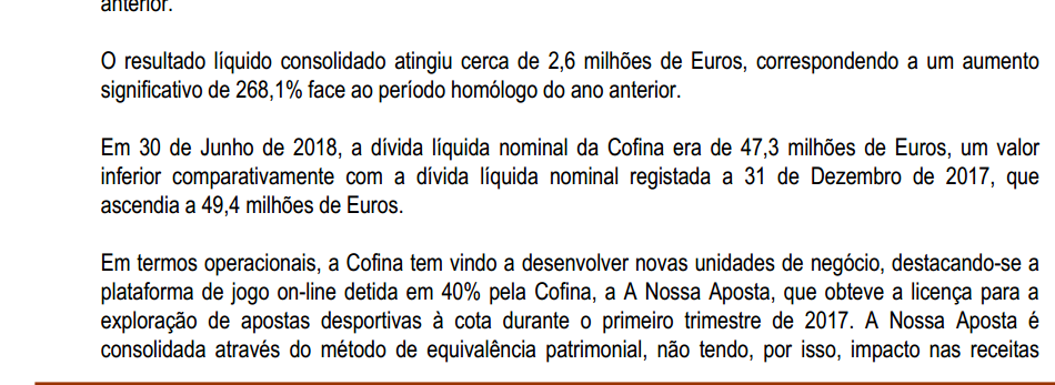 Em cada apresentação de resultados Trimestral O Valor que a "Aposta Desportiva " acresce aos resultados apresentados pela empresa COFINA É ZERO.