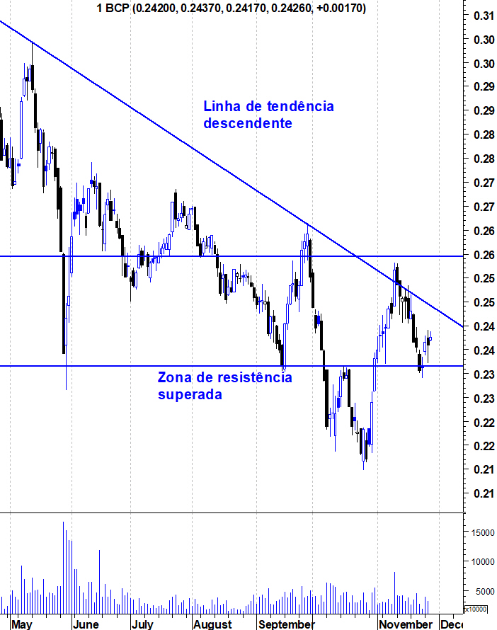 EAGLE BULLMARKET Escreveu:BCP mantem-se em TENDENCIA DE QUEDA há 8 sessões sucessivas , após ter feito máximo recente nos 0.258 , após apresentação de resultados , testando nessa altura a Mm200 sem a conseguir ultrapassar .