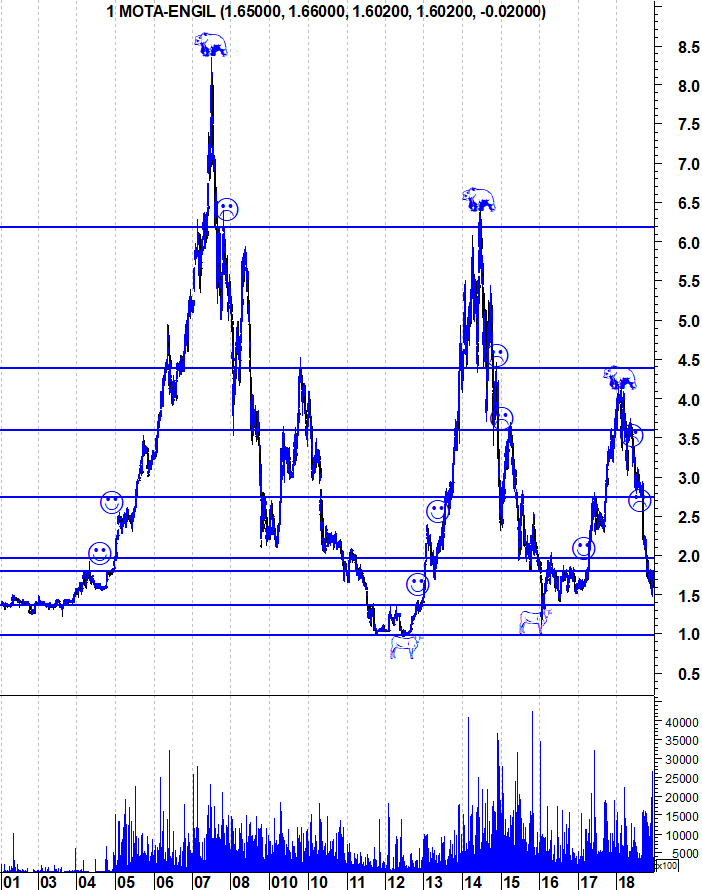Depois de 2 dias de ressalto violentíssimo, a Mota regressou às quedas. O condão daquele ressalto é que veio reforçar a zona dos 1,81 como ponto de referência para a Mota. A acção continua no seu "Bear Market" e, para quem quer entrar no papel, deve esperar a quebra de uma resistência que indicie que algo mudou. Neste caso, a quebra da resistência dos 1,81 euros seria um forte sinal de força. enquanto isso n~ºao acontecer, todas as subidas são apenas meros ressaltos antes do regresso às quedas.