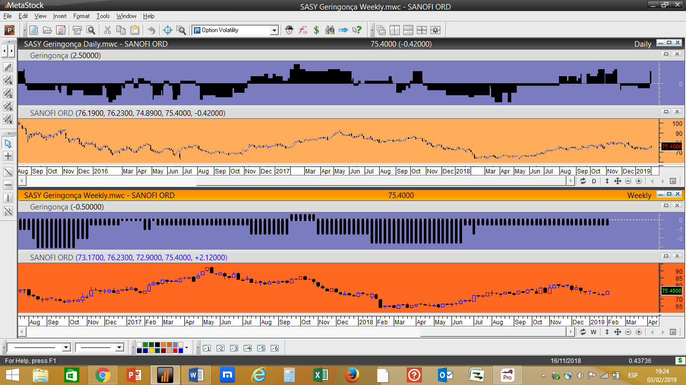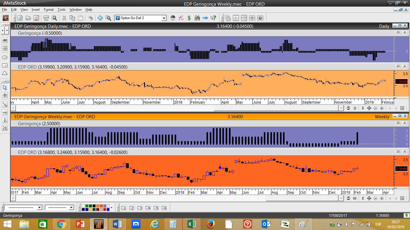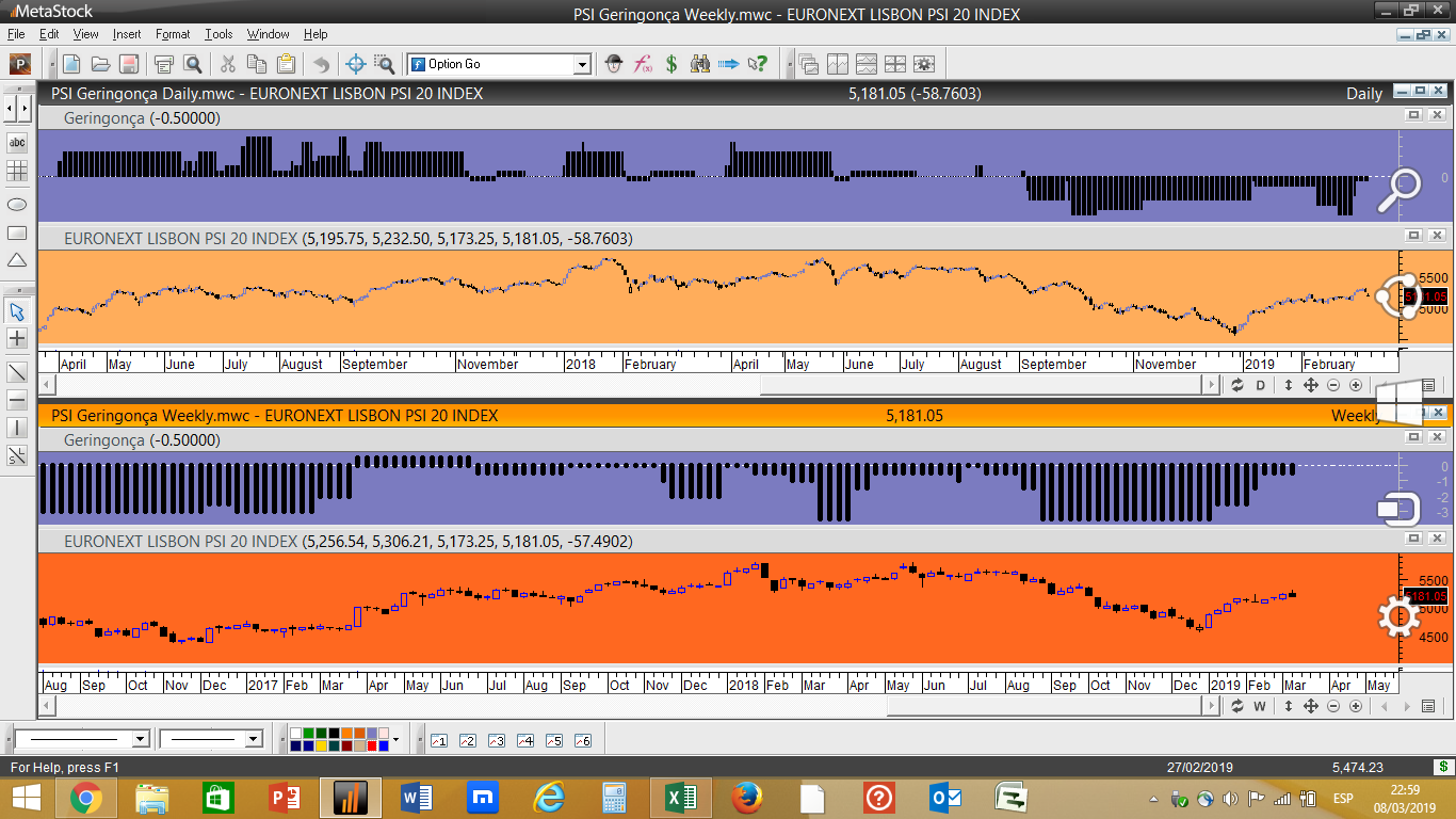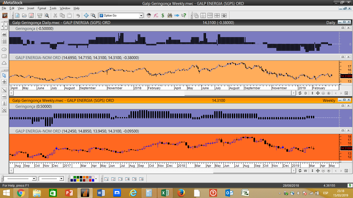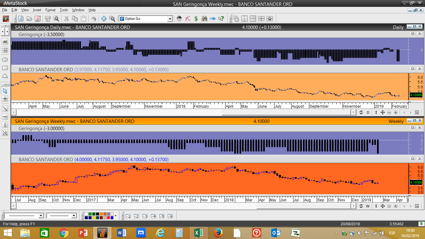 Em termos simplistas isto funciona com 5 indicadores tendenciais e 3 oscilatórios, quando um dos indicadores de oscilação acha que estamos perante um nível de resistência importante acrescenta um valor negativo ao ranking geral, desincentivando uma compra nestes níveis. Pelo contrário, se for localizada a cotação próxima dum determinado nível considerado como suporte significativo, independentemente do papel descer a sua cotação, nesse caso poderíamos ter um pequeno aumento do ranking e favorecer uma aproximação a possíveis compras.