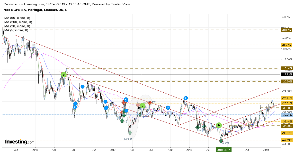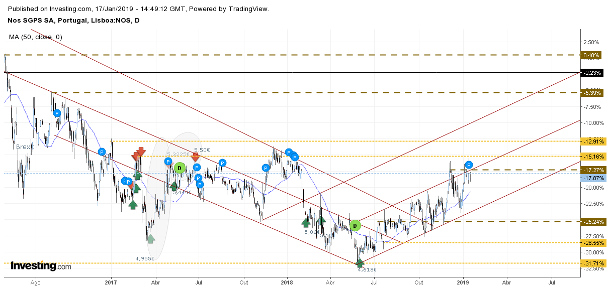 Podes sempre especular com 1001 razões, mas nunca saberá a razão verdadeira. Por isso, enquanto outras acções caiam durante o ano passado, a Nos já sobe há 10 meses, pelo que também poderás especular que as menores subidas recentes têm a ver com o melhor desempenho nos últimos meses. Mas seremos nós apenas a atirar "bitaites" para o ar, não nos vai ajudar em nada no "trading"
