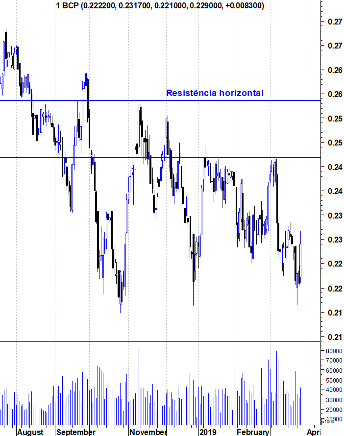Apesar da sua subida de hoje, o BCP mantém a sua tendência descendente. Aquilo que os touros precisam é de uma quebra da resistência na zona dos 0,258. A ruptura da resistência na zona dos 0,247 seria um bom primeiro sinal, mas só a quebra da outra resistência me faria vestir o fato de touro.