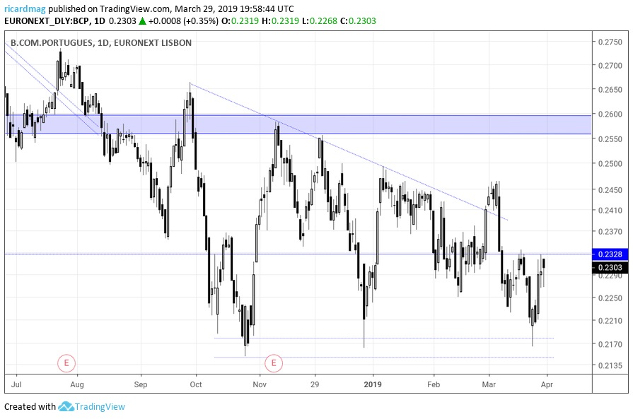 O Stoxx600, desde o início deste ano, já leva um ganho de 13,6%, uma valorização que supera a queda de 13,24% registada em 2018. O BCP, que faz parte desse índice, pelo contrário, não só não recuperou das perdas de 2018, como leva já uma desvalorização de quase 10% desde o ínicio do ano. Hoje, após a divulgação da subida do rating da dívida e dos depósitos do BCP, pela Moody’s, o BCP começou a reagir e a sair da letargia que até então o dominava e os milhões que estavam colocados na venda depressa eram 'comidos' pela pressão da compra até a cotação ter chegado à 'parede' de mais de 3 milhões colocados na venda a 0,233 e que impediu maiores subidas. Foi nítida a intenção de não deixar subir mais o BCP e de o manter nestes patamares, quando grande parte do sector por essa Europa fora fazia máximos atrás de máximos. Há quem diga que são movimentos naturais, mas começo a suspeitar de outras razões para manter o BCP neste intervalo de cotação, entre os 0,23 e os 0,24. O futuro dirá se as minhas suspeitas têm razão de ser ou não.