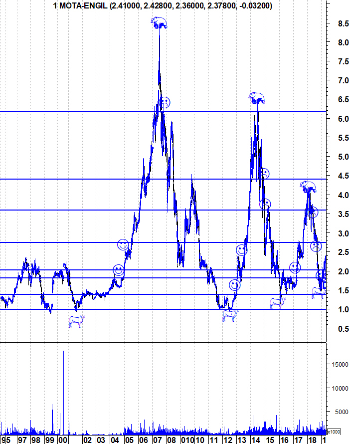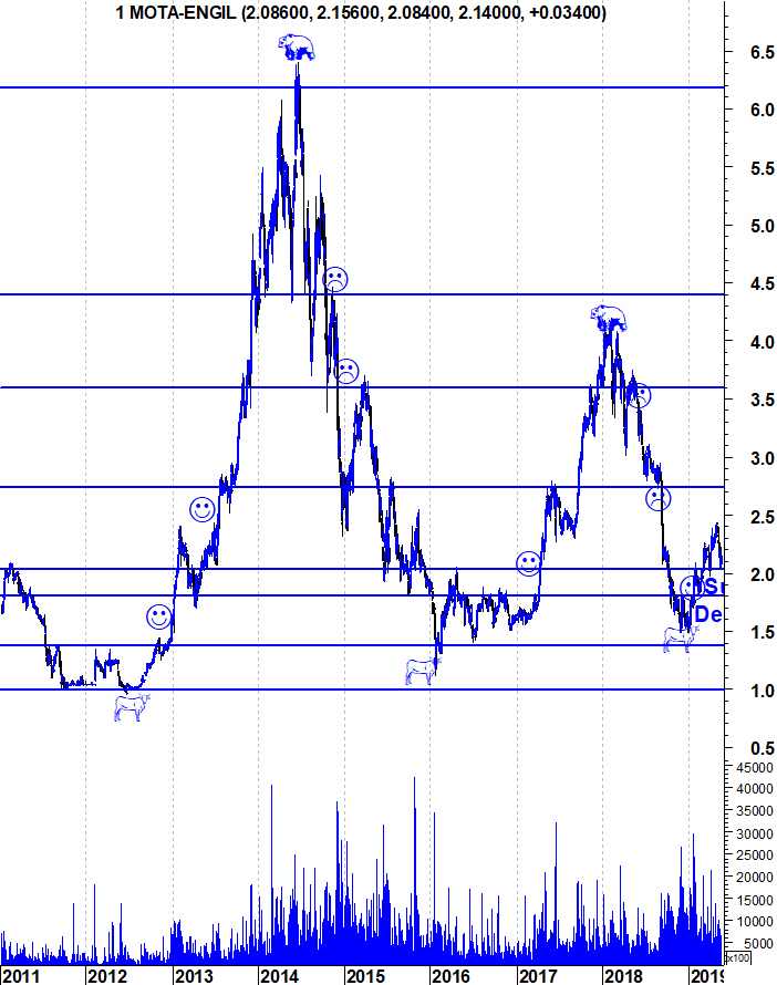 Deixo aqui os gráficos actualizados da Mota que desde que deu o primeiro sinal de força, quebrando a resistência dos 1,8 euros, já leva quase 30% de ganhos e em que as retracções aos suportes têm provado ser boas oportunidades de compra.