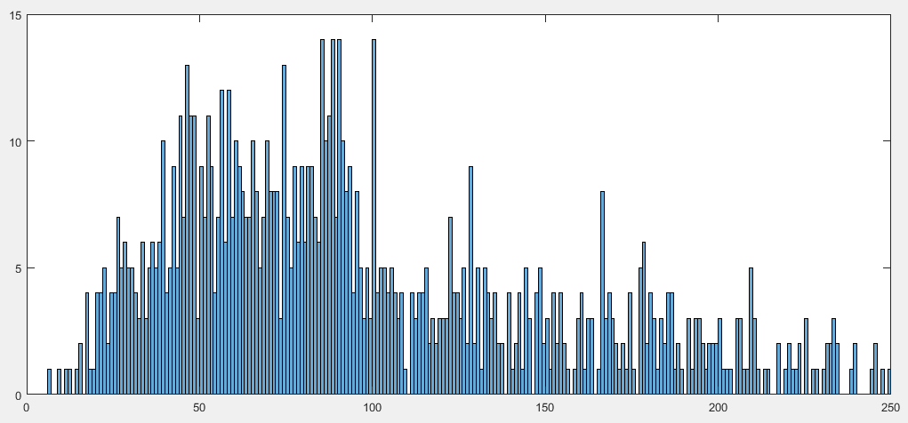 No exemplo encontra-se a distribuição da primeira retracção/expansão para cada swing sobre todo o histórico para dois títulos (Microsoft e Apple). O histograma está a utilizar bins de 1%, estando truncado a 250%. Nada salta à vista nos famigerados valores de Fibonacci.