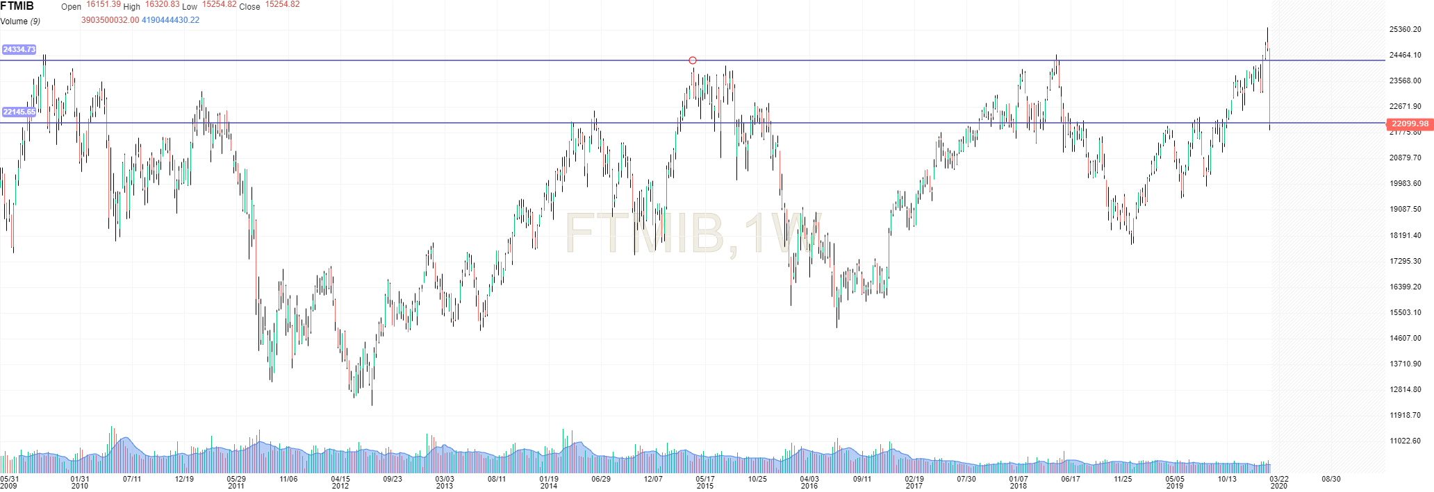 Curiosamente o índice italiano nem tem sido dos mais afectados, está dentro do range da parede que lhe tem bloqueado o bull market na ultima década.