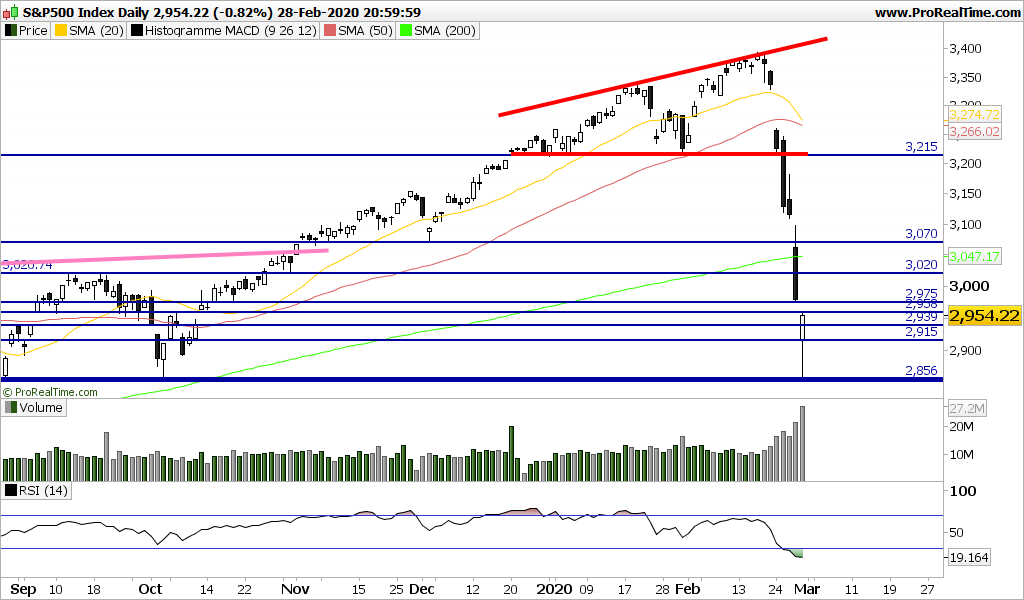 Provável estabilização do "pai de todos os índices Mundiais", o S&P500, para a sessão de hoje, 1/graças ao estado oversold, 2/às mega quedas das últimas 6 sessões, 3/à mini recessão Corona Fev/Mar já assumida por todos e 4/à quase garantida queda da taxa de juro da FED.