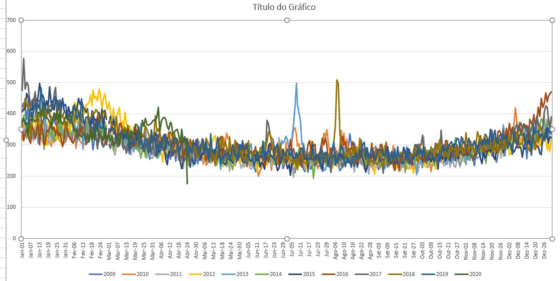 Expliquei depois que o teu grafico induz a erros de leitura porque os picos sao em diferentes dias do ano e fazendo a media esbate esses picos contra o pico do ano em analise.
