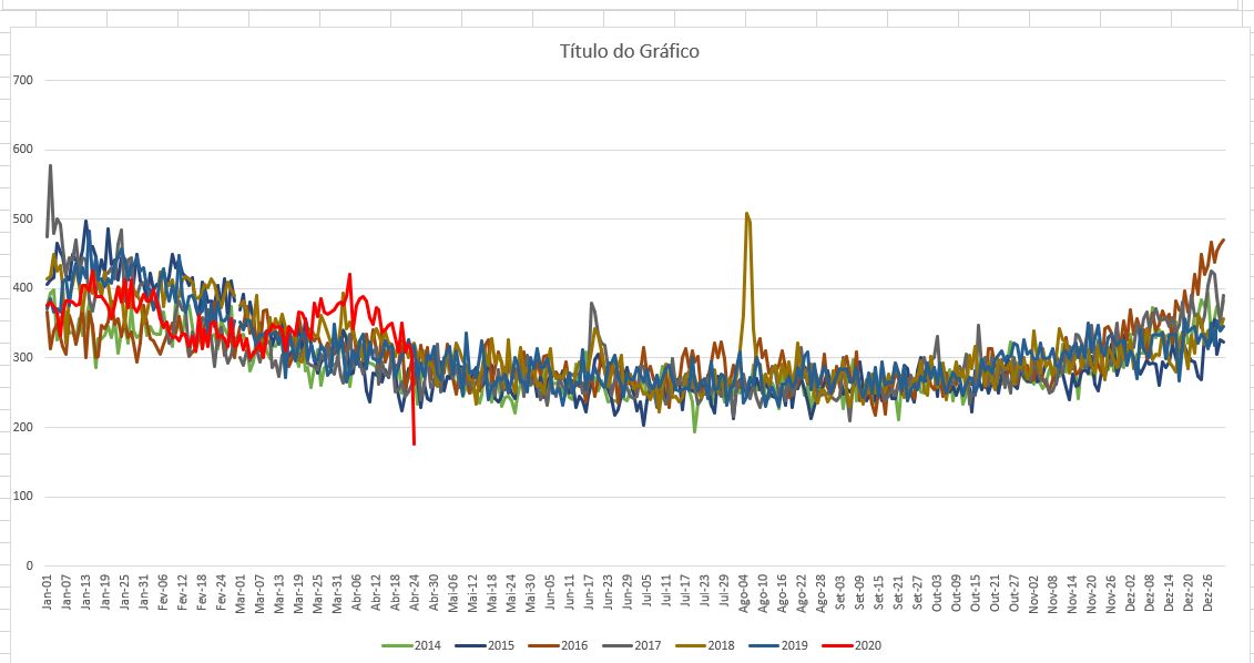 Eu excluí os anos 2009 a 2013 porque os óbitos médios eram mais baixos nesse período (envelhecimento da população? eventualmente). Mas dado que os anos de 2009 a 2013 tinham taxas de óbitos mais baixas, decidi fazer a média apenas a partir de 2014 (conforme está indicado no meu gráfico) por entender que tendo óbitos mais elevados e sendo mais recentes, seriam melhor termo de comparação para 2020. A outra diferença é que excluí óbitos por causas externas (embora o efeito disto seja marginal).