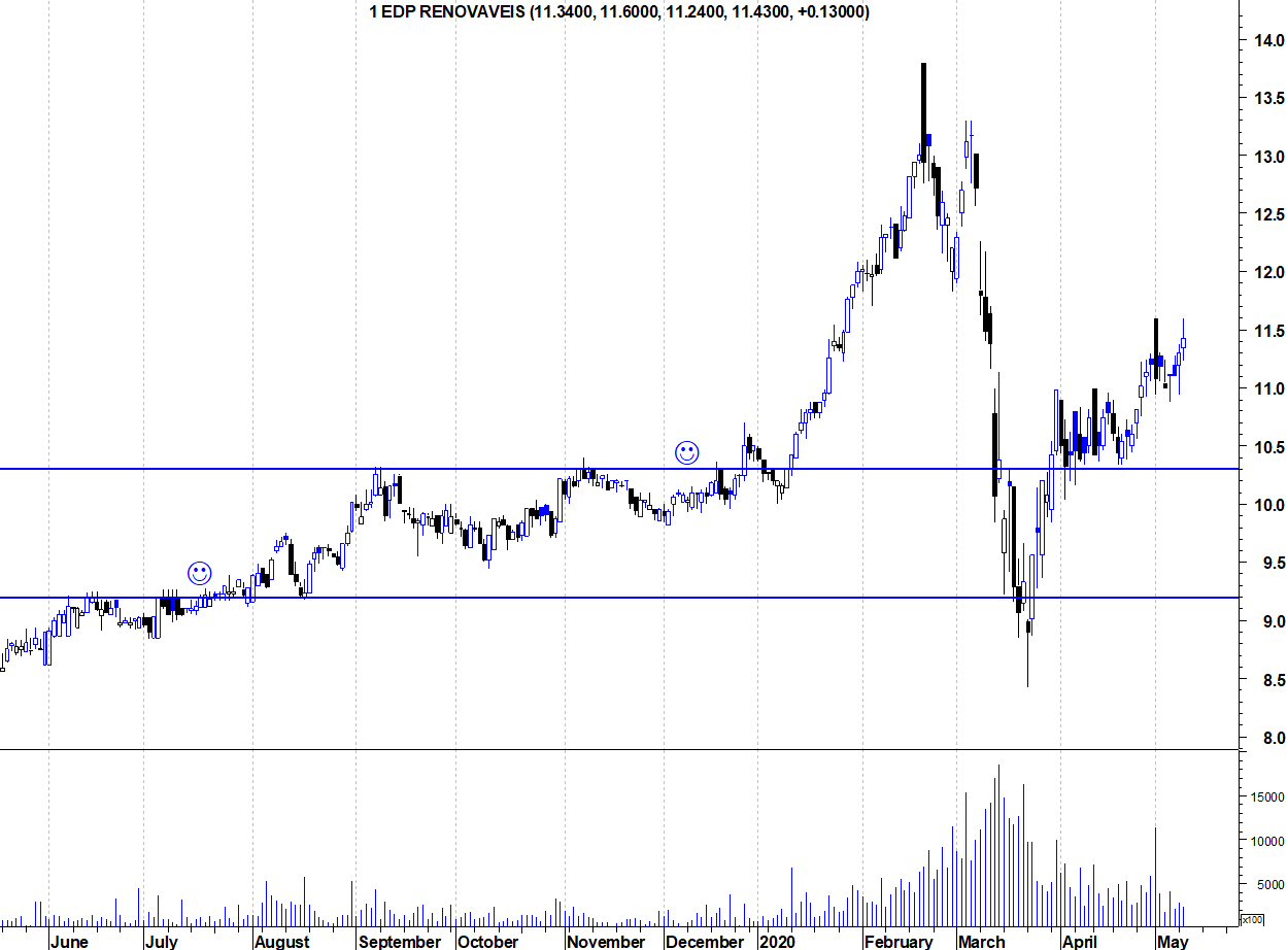 Deixo os gráficos actualizados da EDP Renováveis que tem sido uma das acções que tem mostrado mais força, à semelhança do que ocorreu nos meses anteriores à pandemia.