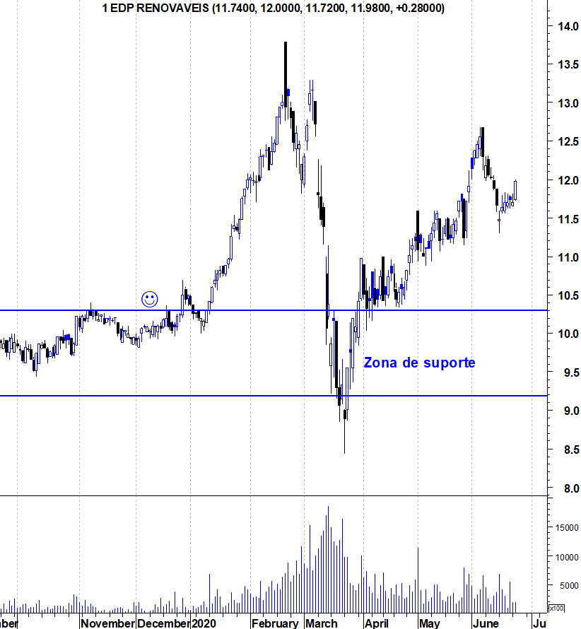 Em termos técnicos, há duas zonas que é importante a EDP Renováveis manter intactas. A primeira, em termos de curto prazo, é a zona dos 11 euros e depois, em termos de médio e longo prazo, é a importante zona de suporte nos 10,3 euros. Enquanto essas zonas não forem quebradas, os touros continuam a mandar na acção.