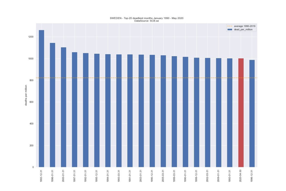 "...No total, 51.405 suecos morreram no período de Janeiro a Junho, um número superior ao de qualquer ano desde 1869, quando 55.431 morreram, na altura em parte por culpa de uma crise de fome. A população da Suécia era então de cerca de 4,1 milhões, em comparação com os actuais 10,3 milhões.