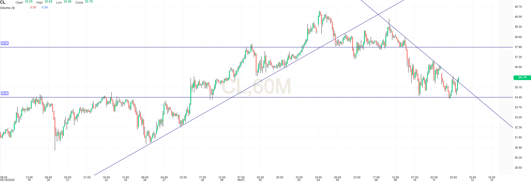 Para não fugir do tópico relativo ao oil parece que temos um triângulo que pode significar mais quedas, no limite poderia ir aos 27. Nessa zona teria sempre um suporte forte, mas duvido muito que consiga sequer quebrar os 34.