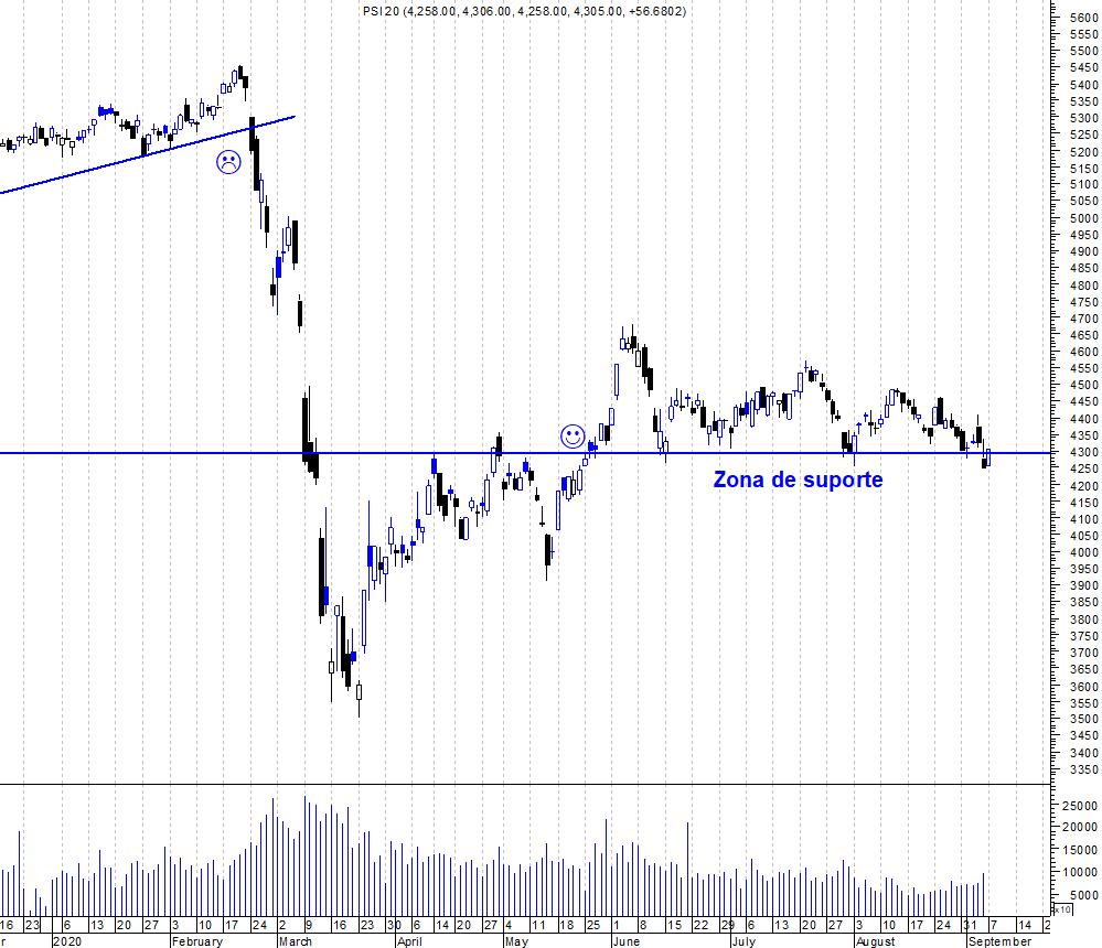 Não te consigo dar uma resposta 100% concreta. Uma sessão em que o PSI fechou um pouco abaixo do suporte, não chega. E há a questão de estarmos a falar de uma zona de suporte, não de um ponto. 52 pontos no PSI, é pouco mais do que 1%, não é relevante, embora seja um sinal de alerta. Se tivermos mais de um fecho e perto dos 2% abaixo da zona de suporte, aí os sinais começam a ser bem mais fortes e podemos começar a pensar na quebra de suporte. Para já, continua a testar essa zona.