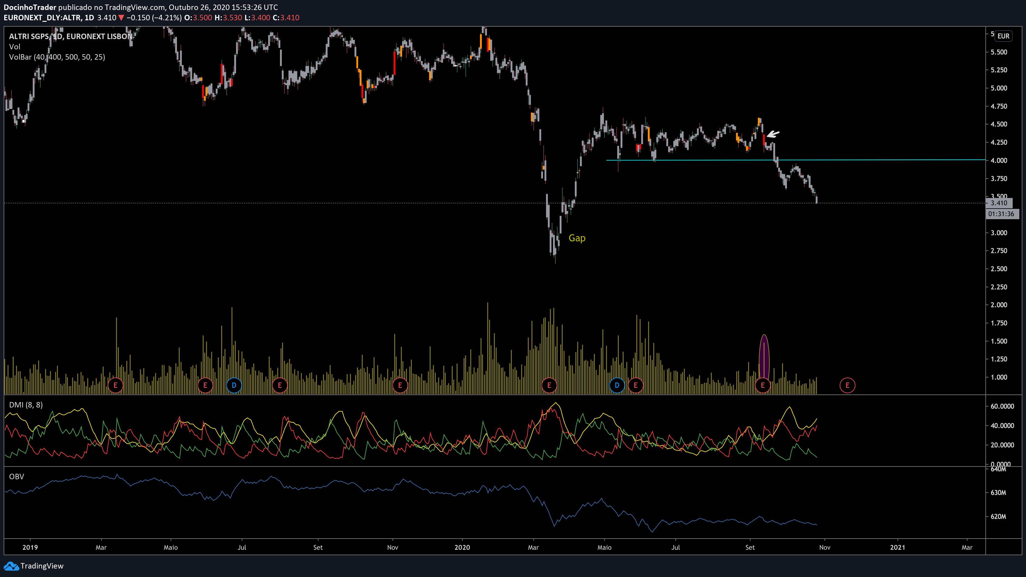 Forza se me permites, acho que a Altri ainda tem muito para cair, vejo ela possivelmente ali fechar o Gap abaixo dos 3 paus assim como o psi nos 3600pts. No entanto o mercado jà revela alguma acumulação no OBV.O trigger de venda foi dado na perda da barra de volume vermelha, onde houve desova pelo volume, confirmado pela entrada de venda também no ADX.
