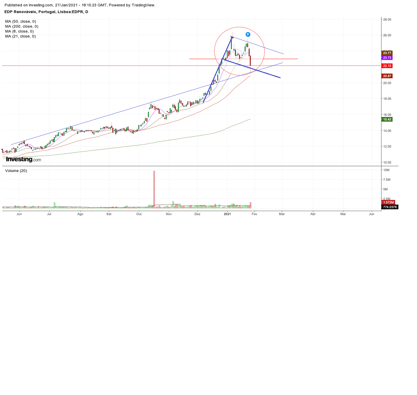 Ainda do ponto de vista técnico a ação subiu sem tirar o pé do acelerador (e sem criar suportes sólidos) durante cerca de um mês, a contar a partir do momento em que quebrou a resistência do seu anterior máximo (~17,60€). No cimo desta subida a ação já estava com valores de RSI elevadíssimos, pelo que teve a sua primeira correção. Depois da primeira correção, voltou a subir, mas infelizmente não mostrou força suficiente para ultrapassar o GAP criado no dia 11 de janeiro. Como não mostrou esta força, como quebrou um "suporte" nos 23,35€ e também nos 22,60€ (um valor que acho chave) caiu de rompante.