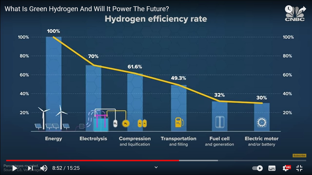 Resposta - Volto a reanexar gráfico (em baixo) efetuado originalmente pelo MIT e transposto pela CNBC. Todas as fases processuais do hidrogénio "verde" são ineficientes e extremamente onerosas e perdulárias (haja Governos ricos e UE para absorver esses biliões de prejuízos e assim vai ser GARANTIDAMENTE um sucesso comercial. Tenho 100% a certeza que os investidores vão ganhar MUITO com este negócio).