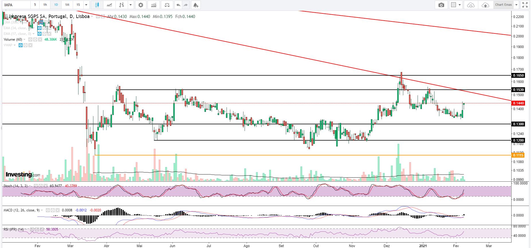 Álvaro, relativamente a cotação falta entrar volume, o que vemos no gráfico diário são velas que representam 10k, 20k, 30k euros, é muito baixo, falta volume e noticias catalisadoras para a Impresa sair desta lateralização que está desde o inicio da pandemia.