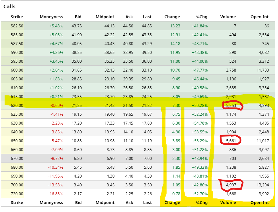 TESLA: Call Volume acima do normal para valores de $620,00, $650,00 e $700,00 e francamente bullish..