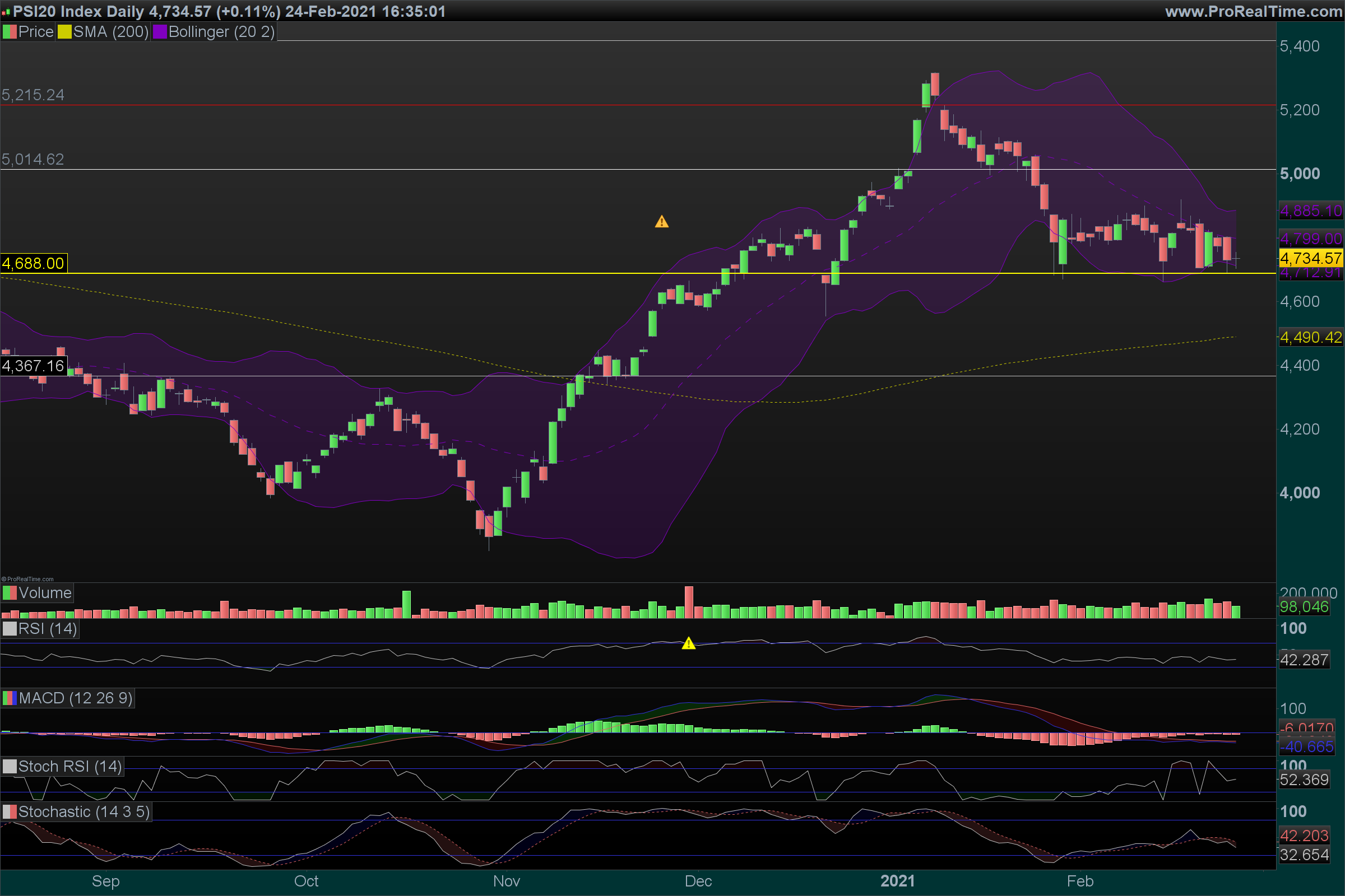 Tecnicamente tudo indica que o PSI tem espaço para continuar a crescer por algum tempo, de momento não aparenta nenhum sinal de venda, o primeiro sinal seria com a quebra dos 4690.
