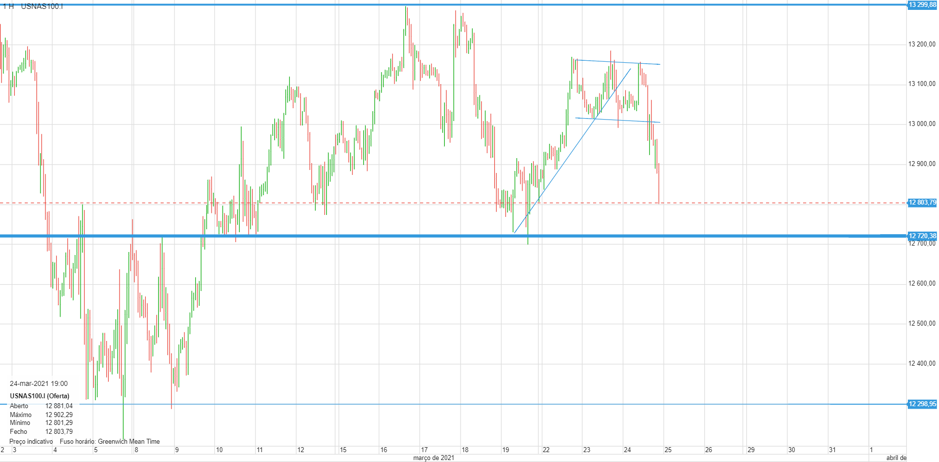A zona dos 12700 a suportar o indice. No gráfico horário, é visível a quantidade de vezes que já o fez. A pergunta de um milhão de dólares é se vai aguentar uma vez mais...