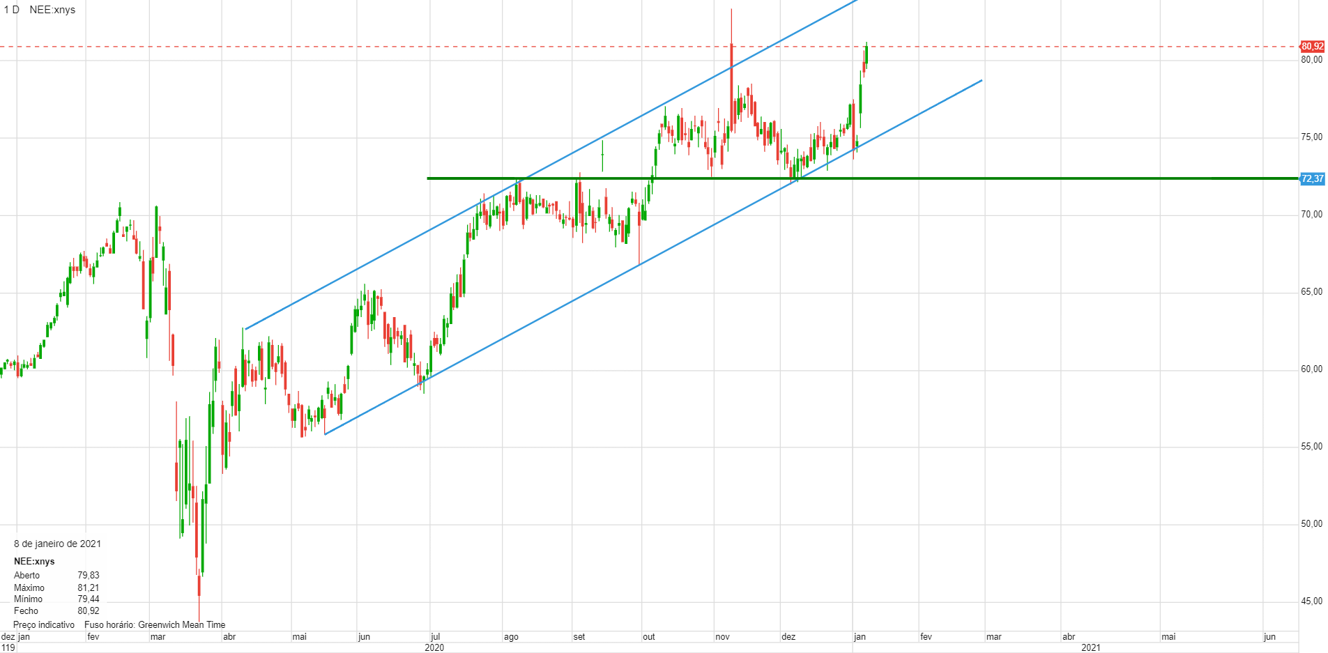 No gráfico semanal é possível ver a subida consistente desde 2017. No curto prazo fez depois da correção de Março, um canal ascendente relativamente bem definido. Tem um importante suporte na zona dos 72$, pelo que permite uma entrada com um stop relativamente curto.