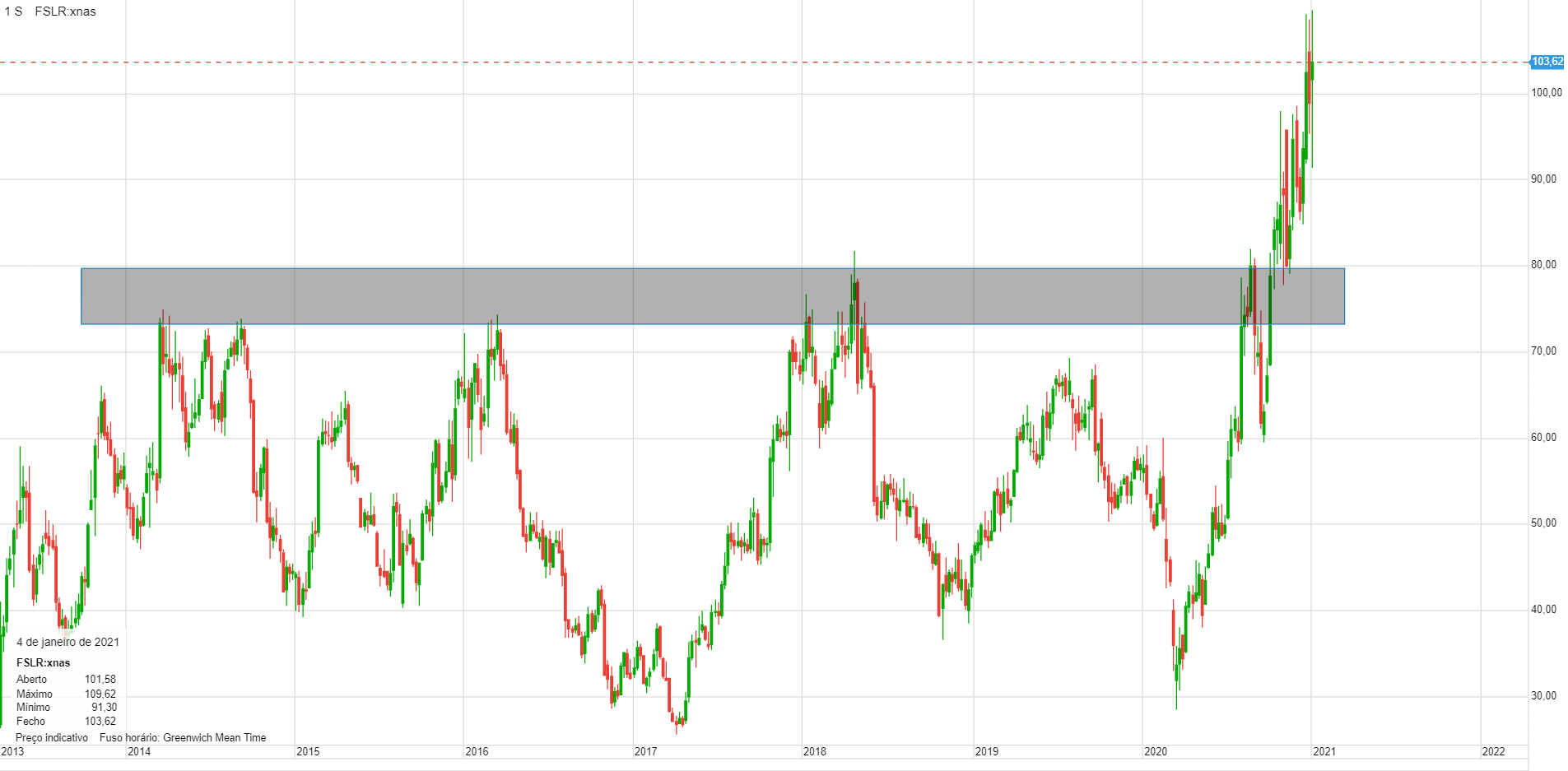 No LP é possível ver uma zona de resistência na zona dos 75/80$, onde a acção andou por vários anos. Essa zona foi quebrada em alta em Outubro deste ano.