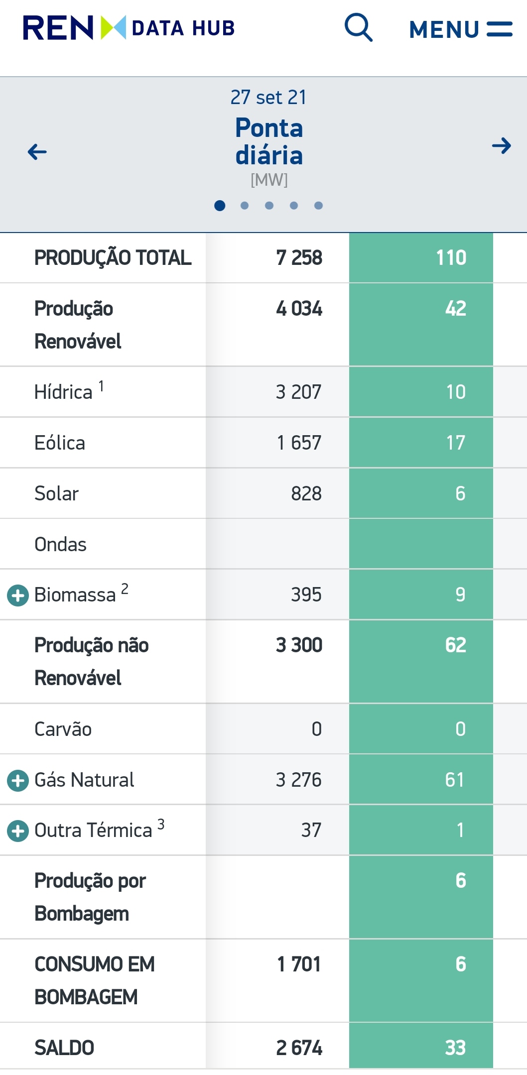 A coluna do lado esquerdo respeita à Ponta Diária em MW.